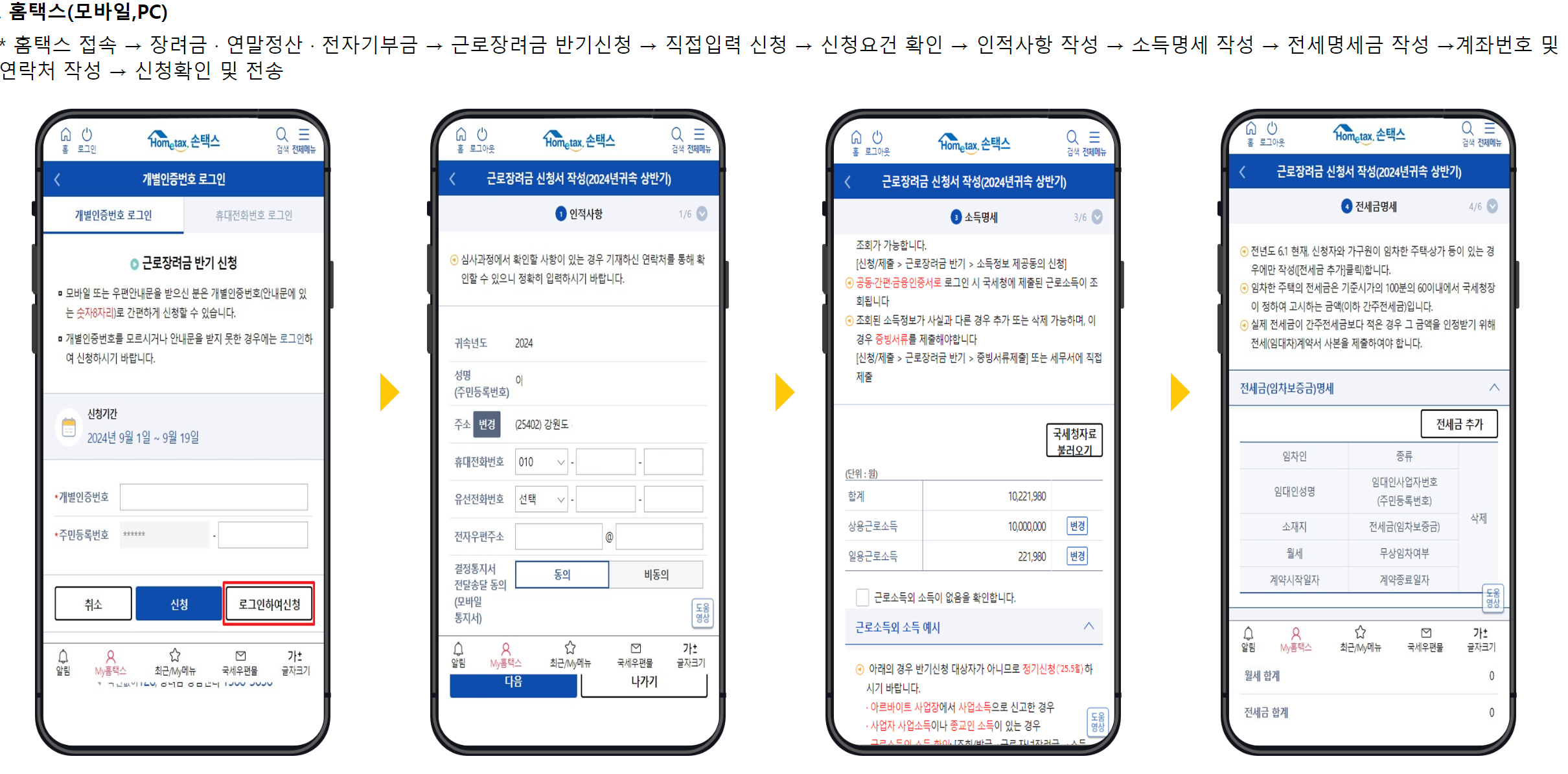 홈텍스 > 장려금. 연말정산. 전자기부금 > 근로장려금 반기신청 > 직접입력 신청 > 신청요건 확인 > 인적사항 작성 > 소득명세 작성 > 전세명세금 작성 > 계좌번호 및 연락처 작성 > 신청확인 및 전송