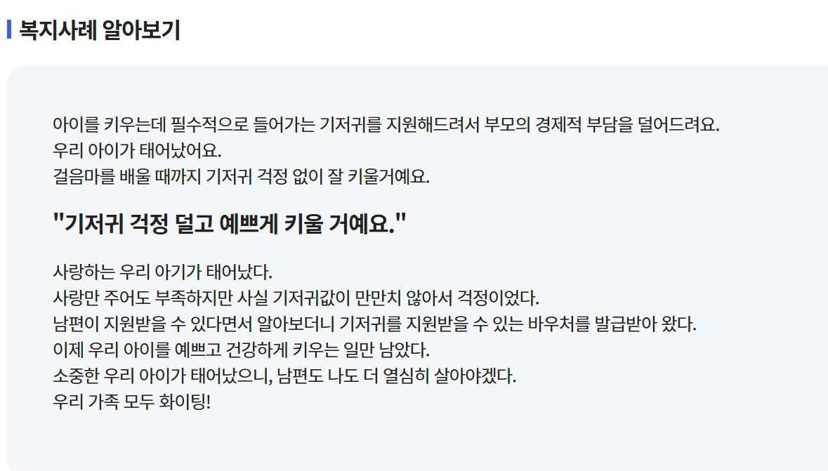 "기저귀바우처는 저소득층과 다자녀 가정에게 매월 기저귀 구입비를 지원해 주는 정부 제도입니다."