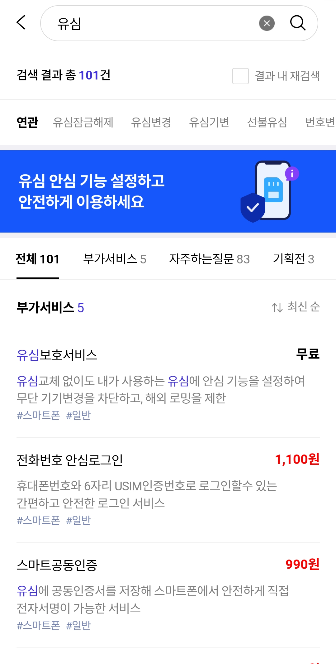- '부가서비스' → '안심/보험' → '유심보호서비스' 메뉴 이동