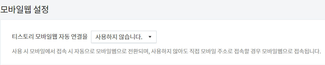 꾸미기-모바일에서 모바일웹 설정을 보시면 모바일웹 자동연결을 사용합니다/사용하지 않습니다를 선택하게 됩니다.