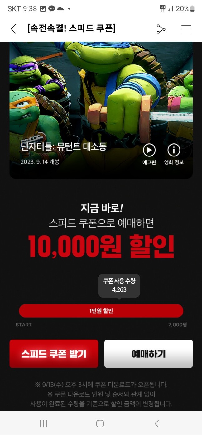 매일매일 들어갈 필요 없이 사진아래와 같이 쿠폰다운로드 오픈 시간이 공지되어 있으므로 원하는 영화를 그 공지시간에 맞춰 들어가셔서 쿠폰을 다운로드하시면 됩니다. 다운로드 기간이 지났음에도 쿠폰이 남아 있는 영화들도 있으니 영화를 좋아하시는 분들은 다양한 영화를 공짜로 보실 수 있습니다.