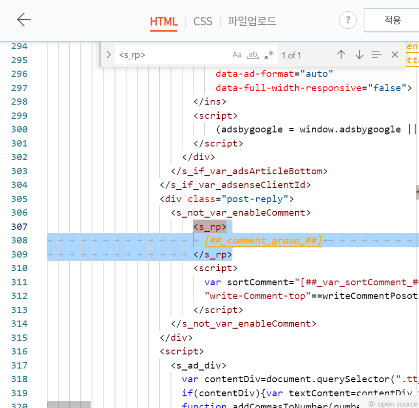 사진처럼 <s_rp> 에서 </s_rp> 까지 드래그 해줍니다. 삭제 해준후 상단에 적용을 눌러줍니다.
