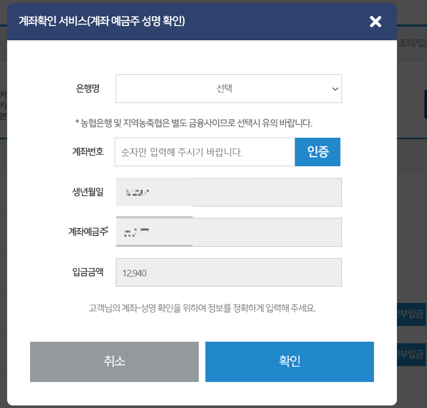 8. 은행을 선택하고 계좌번호를 인증합니다. 그리고 확인을 눌러서 입금을 받습니다.