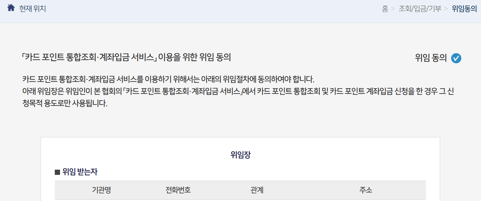 5. 인증을 마치게 되면 우측상단에 위임동의를 클릭하고 아래로 내려 확인을 눌러줍니다.