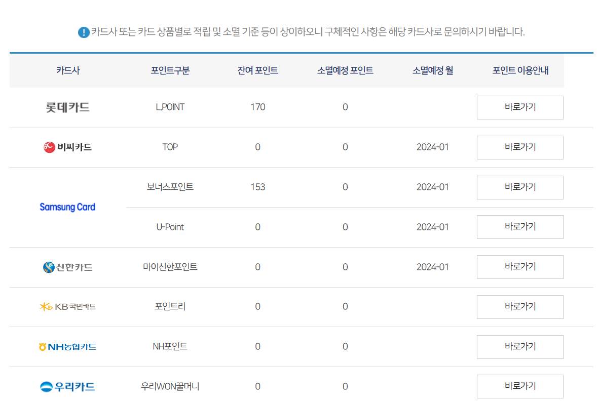 9. 마지막으로 아까 카드포인트 계좌입금 좌측에 있는 카드포인트 통합조회를 눌러서 들어가게 되면 현금화가 되지 않는 포인트도 전부 나오게 됩니다. 소멸예정 월까지 나오게 되니 참고하기 바랍니다.