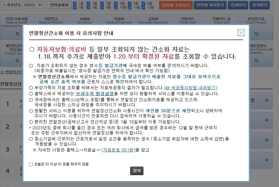 ✅주의점! 자동차보험, 의료비 등 조회되지 않는 간소화 자료는 1월 20일부터 확정된 자료로 조회 가능하니 이점도 꼭 유의하시기 바랍니다.